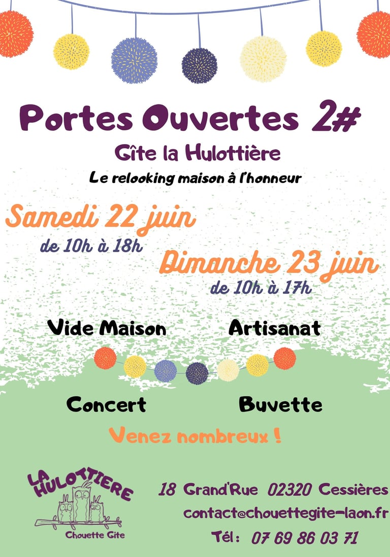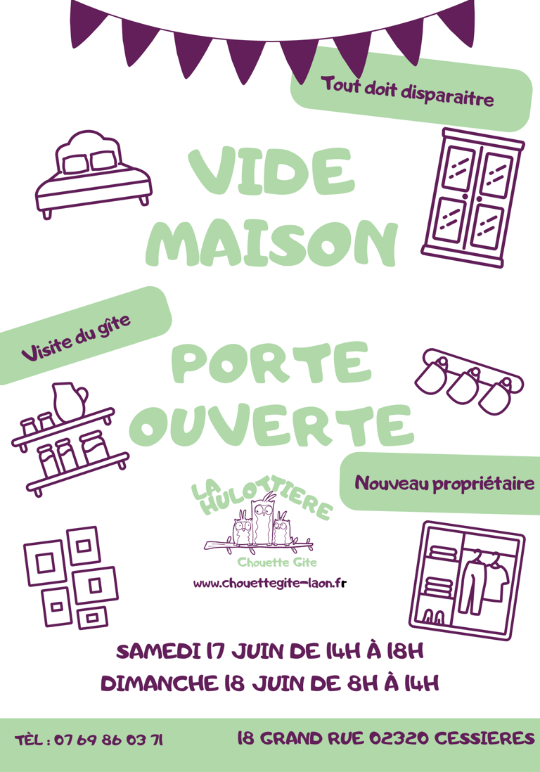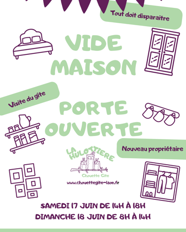 Nous ouvrons les portes de notre chouette gîte durant un week-end, venez visiter les lieux pour fêter la fin des travaux et l'ouverture à la réservation de tous les espaces. A cette occasion, nous organisons un vide maison. Meubles anciens, vaisselles, décoration, venez chiner à la Hulottière samedi de 14h à 18h ou dimanche de 8h à 14h.