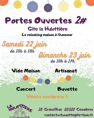 Nous ouvrons les portes de notre chouette gîte durant un week-end, venez visiter les lieux et découvrir des artisans sur le thème du relooking maison. Ce sera un moment festif pour chiner, découvrir, boire un verre à la Hulottière samedi de 10h à 18h et dimanche de 10h à 17h.