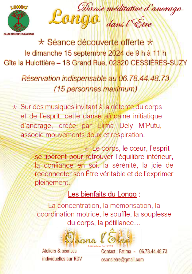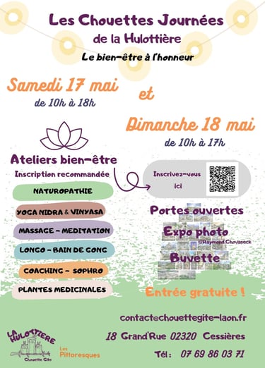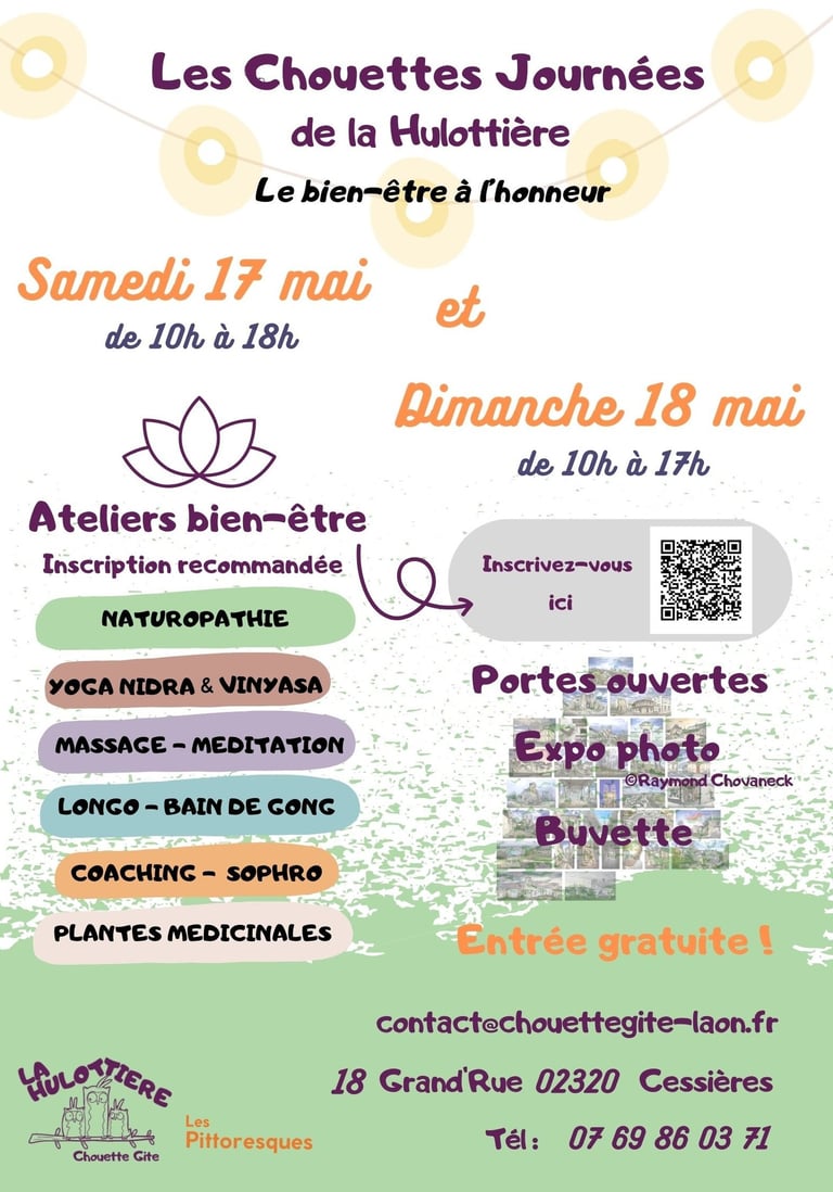 des ateliers bien-être vous sont proposés tout le week-end et vous pourrez rencontrer chaque intervenant autour de leur stand. Une buvette sera ouverte et un photographe laonnois exposera dans la grande salle de la grange.