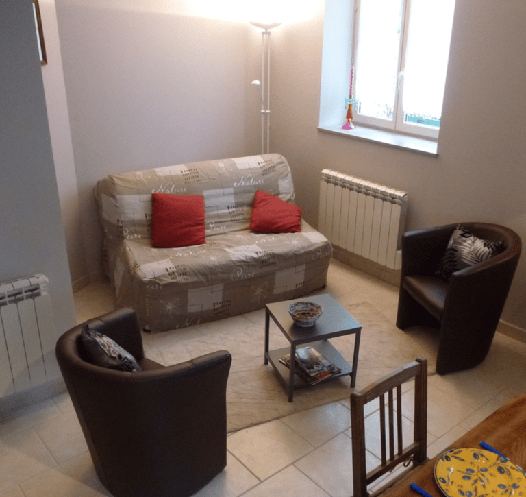 Coin salon avec canapé pour 2 personnes, 2 fauteuils et TV